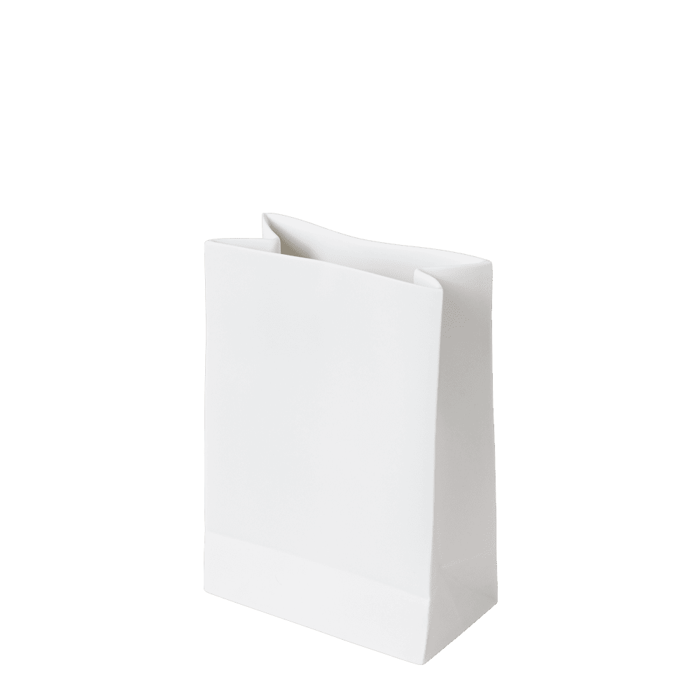 紙袋特有の折り目やたわみの陰影を陶磁器で忠実に再現した「スーパーバッグ」は、焼きものであることの意外性とユーモアを兼ね備えた、機能的にも優れた花器です。#2はボリュームのある花も生けやすい、やや大きめの花器。