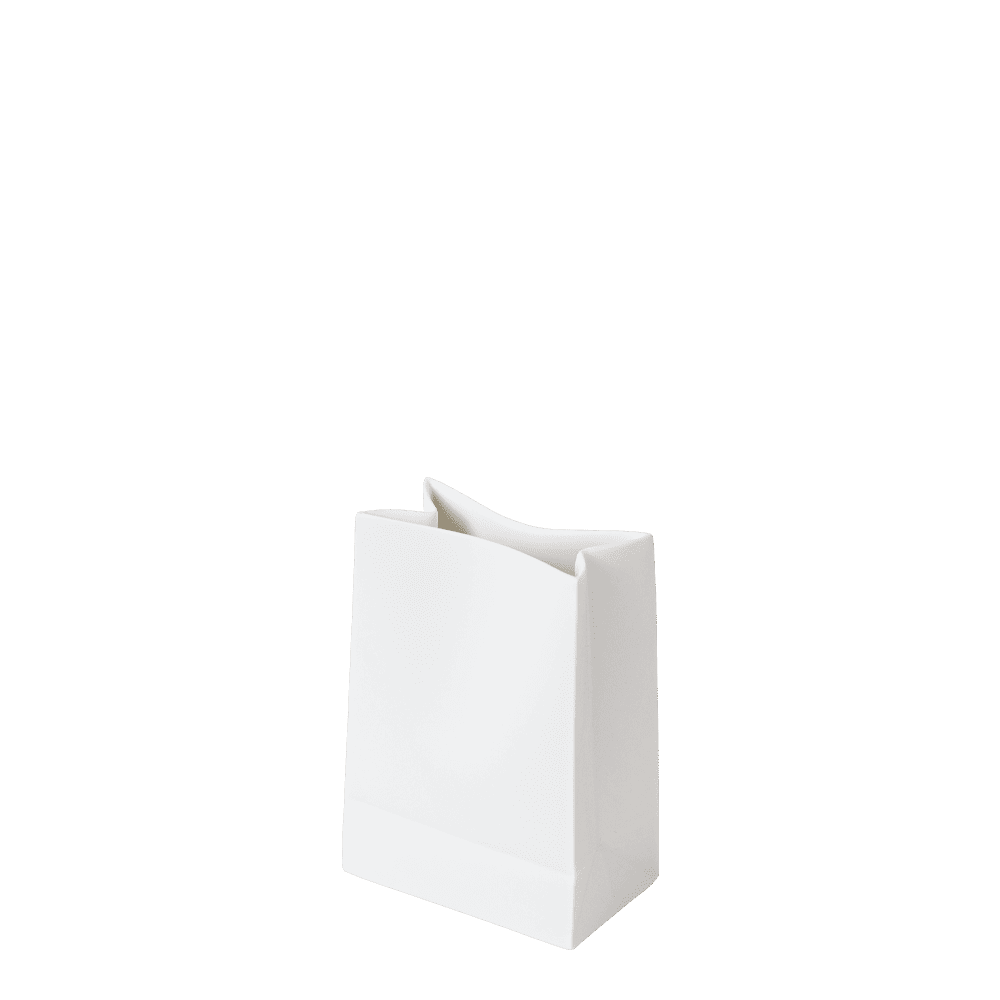 紙袋特有の折り目やたわみの陰影を陶磁器で忠実に再現した「スーパーバッグ」は、焼きものであることの意外性とユーモアを兼ね備えた、機能的にも優れた花器です。 #3は一輪挿しから小さなブーケまで幅広く合わせやすく、玄関やリビングのワンポイントに最適です。