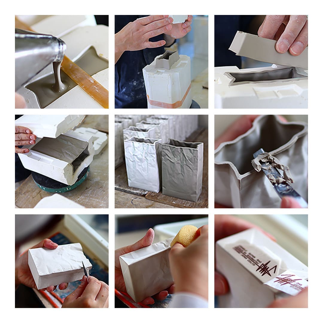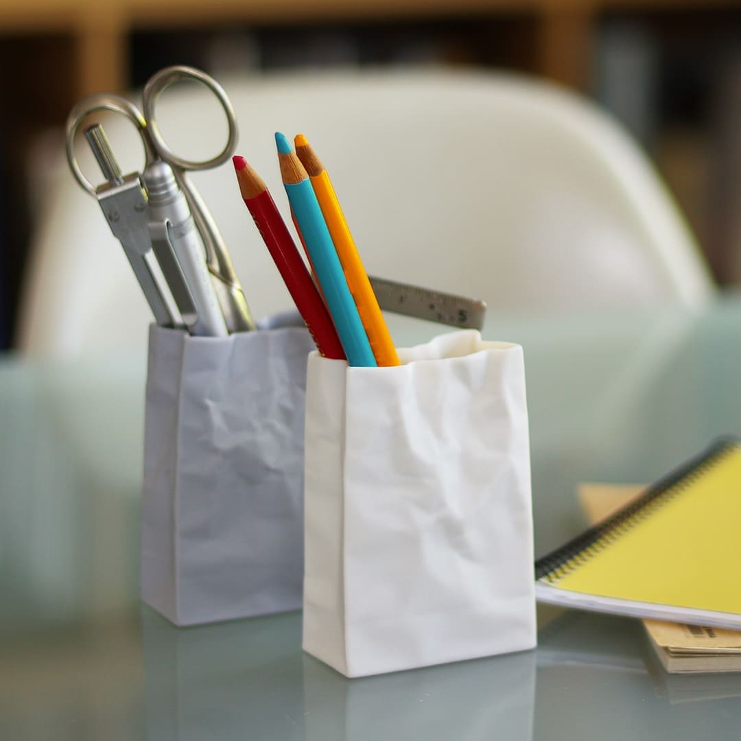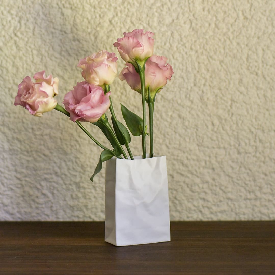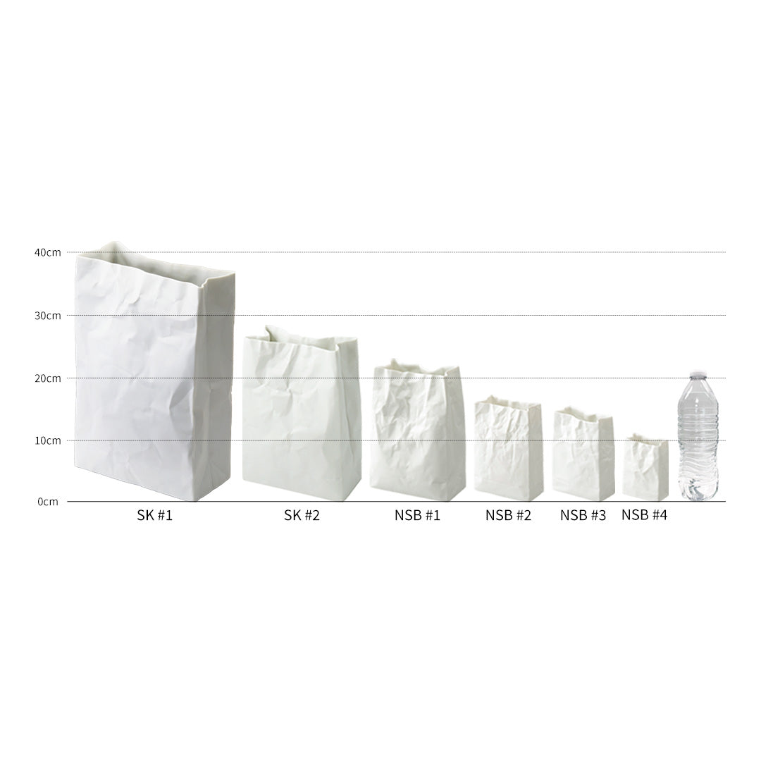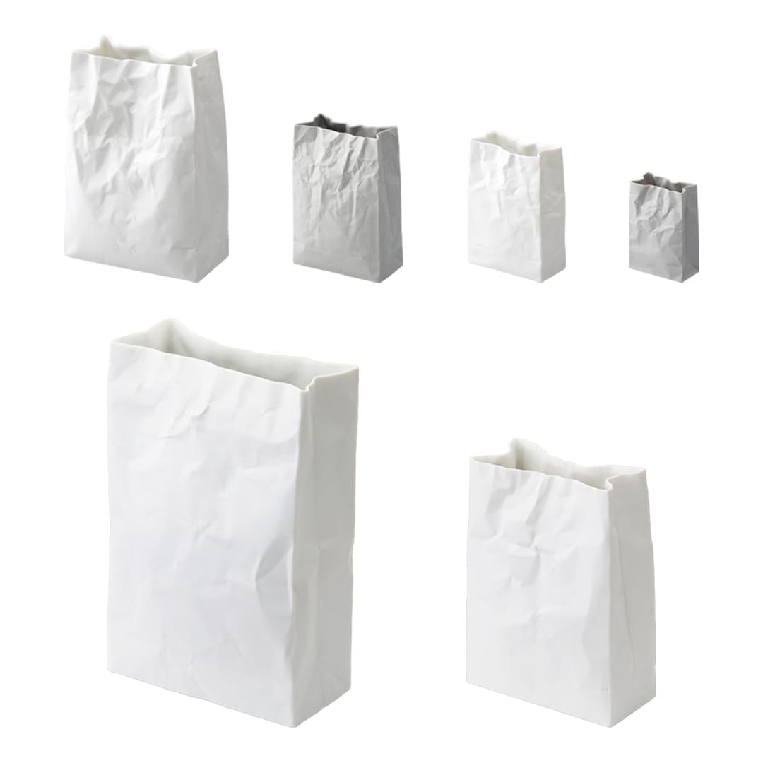 釉薬を使用しないビスク仕上げによるマットな質感で、テクスチャーの陰影が美しい花器です。手のひらサイズのかわいい紙袋は、花器だけでなくデスク周りでステーショナリーなどを入れるなど、幅広く使うことができます。