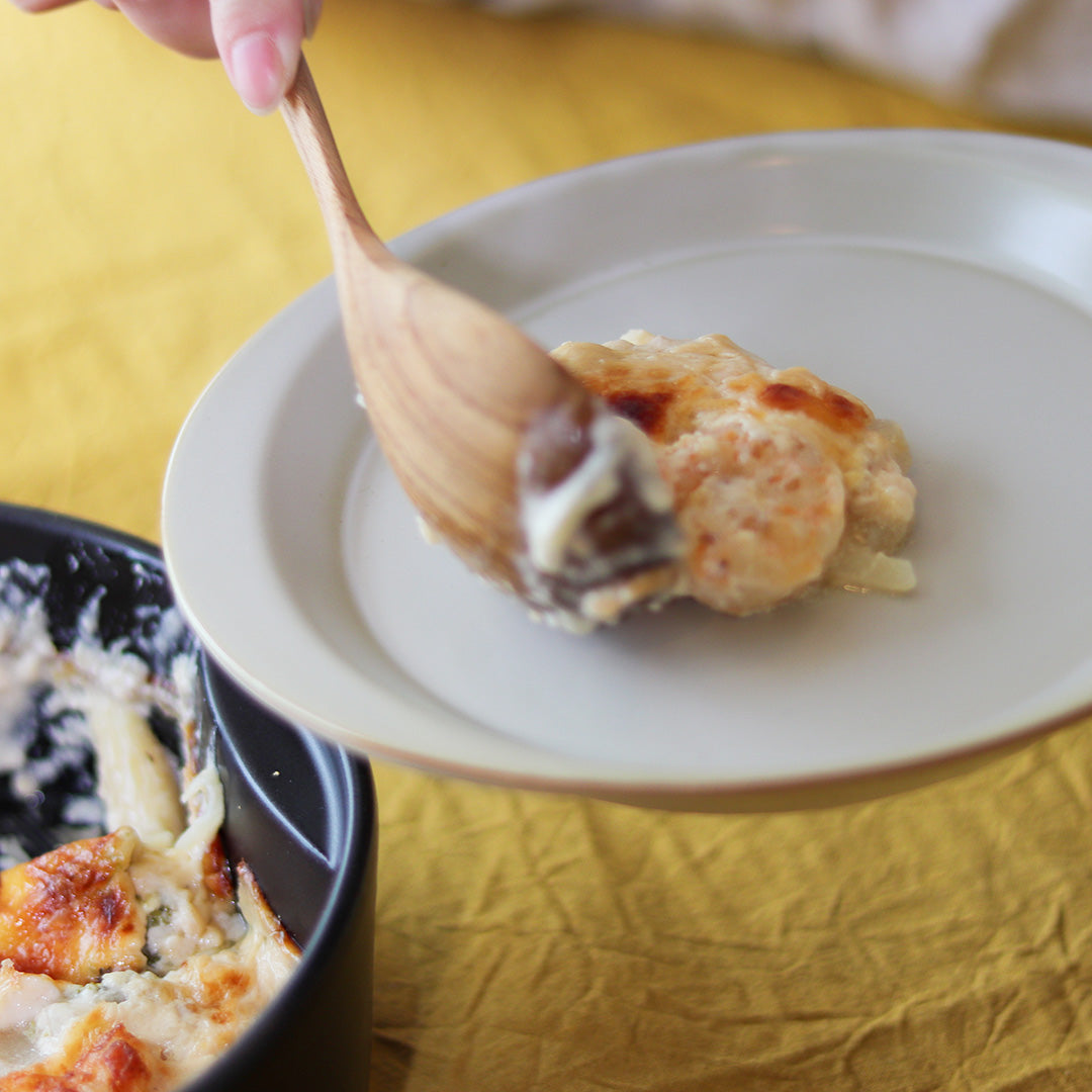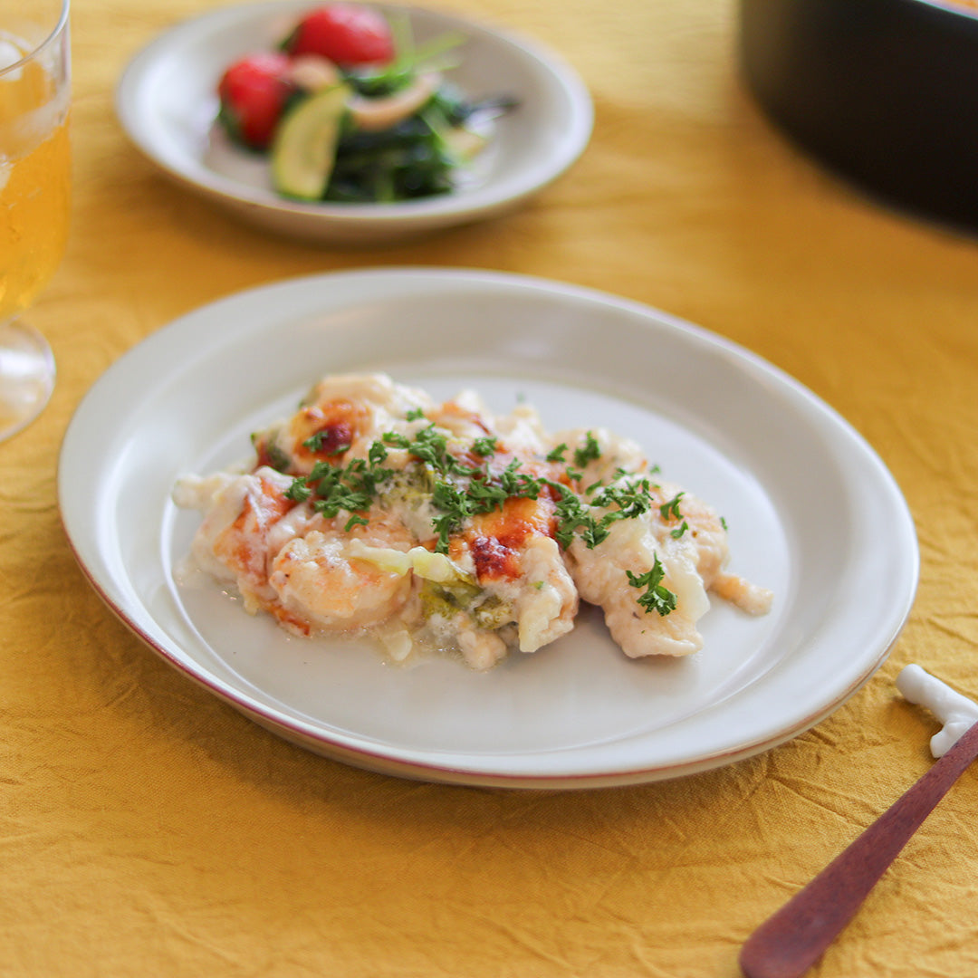 デュエットのプレートは、サイドにリムが付いた持ちやすいデザインが特徴です。Lサイズは幅約19.5cmで、幅広い用途に対応できます。ホワイトは、半マットの窯変釉で奥行きを感じさせる風合いを生み出しています。