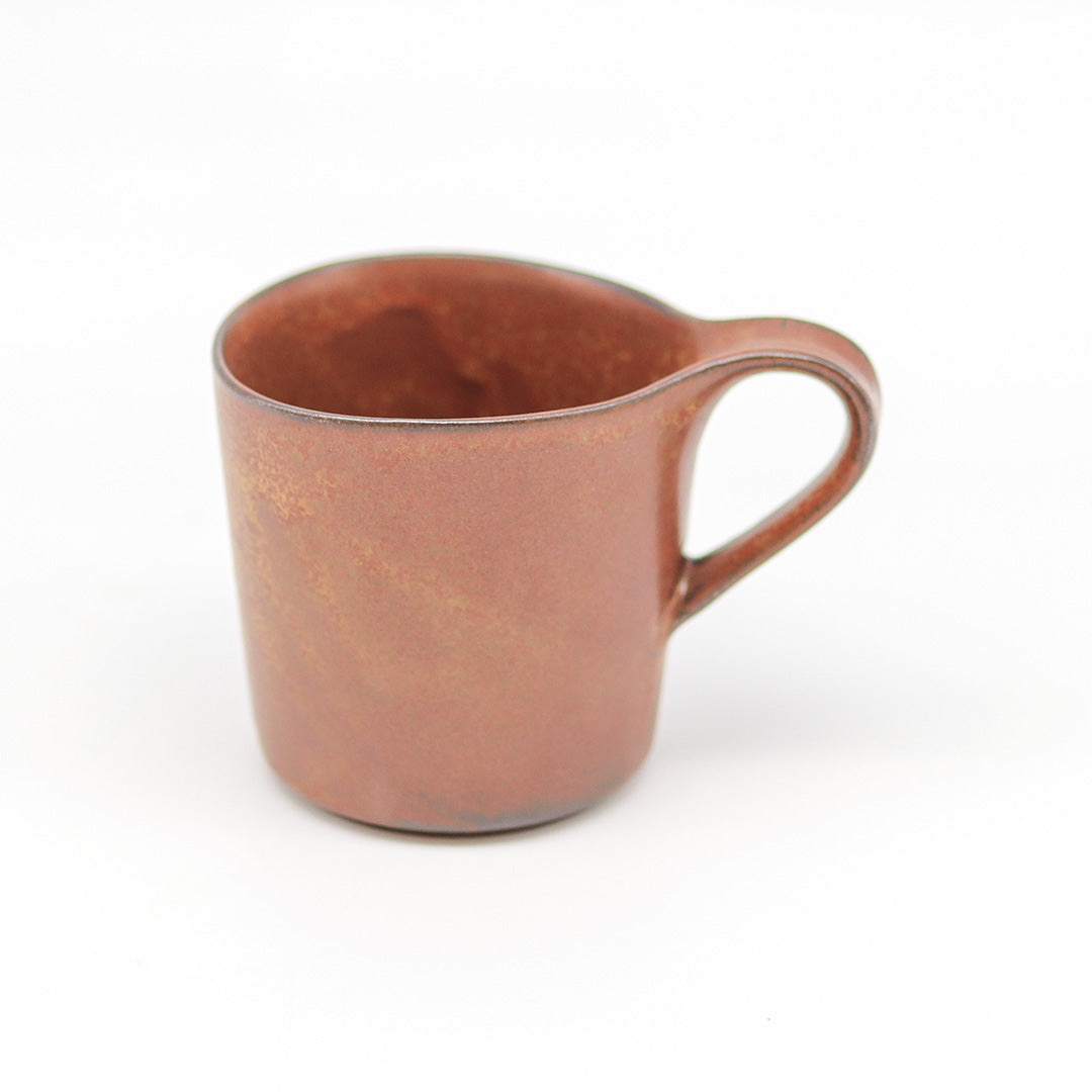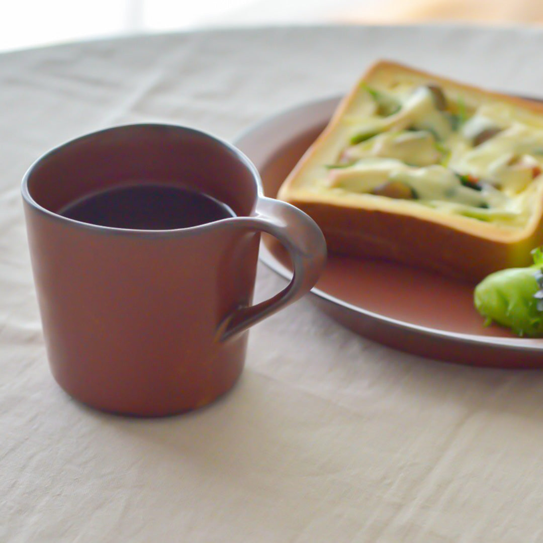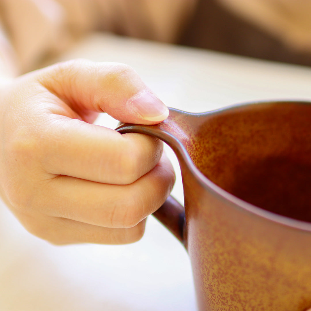 デュエットのマグは、上から見た口径が「飲ませてあげる」動作を形にしたデザインになっています。全体的に角を丸くしたやわらかなフォルムです。ブラウンは、黄色から赤茶色の幅広い表情が生まれる窯変の釉薬を使用しており、一つ一つ異なる表情が楽しめます。
